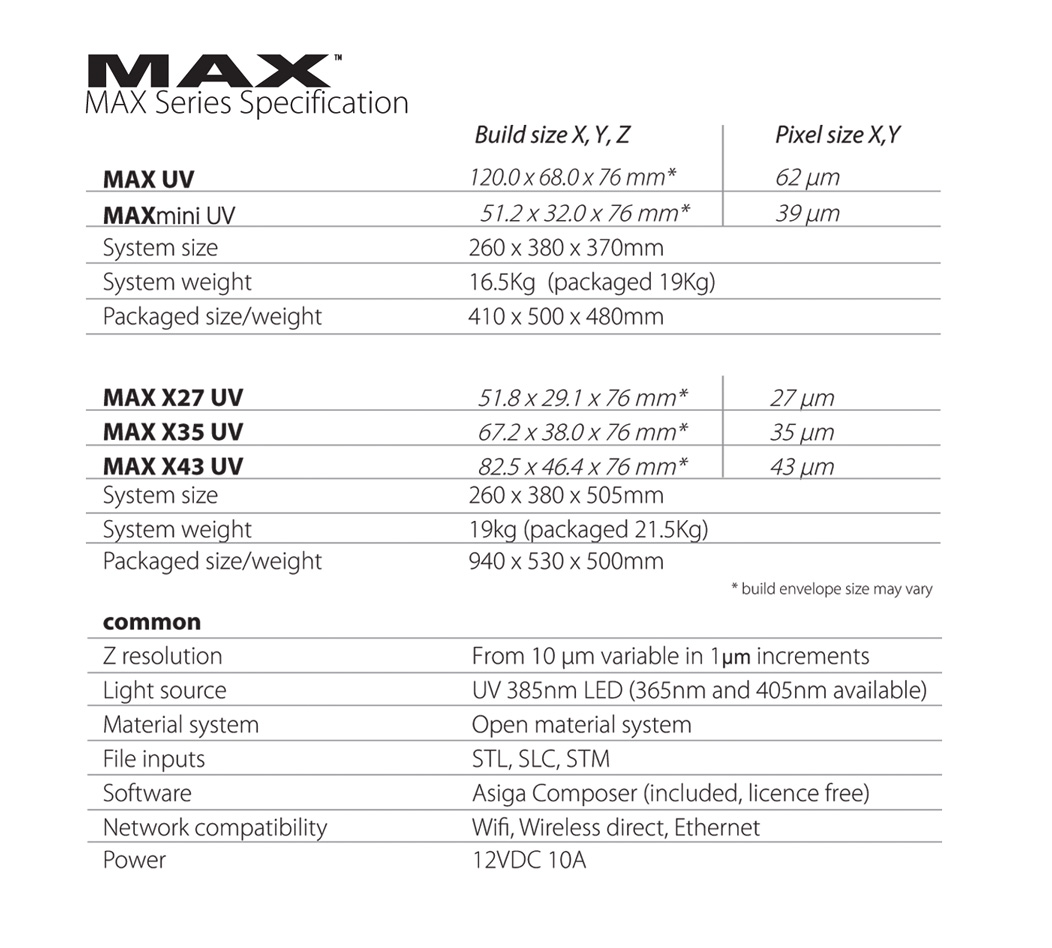 14 rânduri · asiga materials, 100% open material system — use any suitable third party material:.. 14 rânduri · asiga materials, 100% open material system — use any suitable third party material: 3d printer asiga max uv. 67.2 × 37.8 × 75mm. 51.8 × 29.2 × 75mm. Dimensions (h x h x d) 260 x 380 x 370 mm. 2.04 × 1.15 × 2.95 inches. Build volume x, y, z. 119 x 380 x 370 mm.. 67.2 × 37.8 × 75mm.